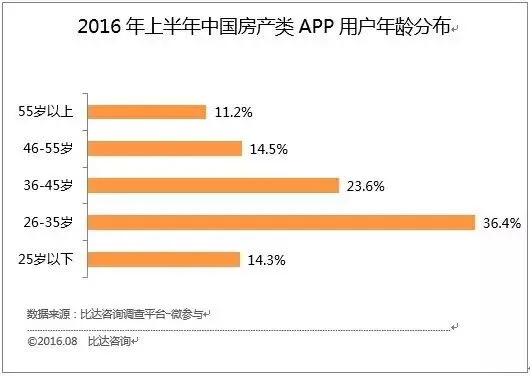 2016年上半年中国房产类APP用户中,男性占54.3%,女性占45.7%。26-35岁的年轻用户占比最高,为36.4%;其次是36-45岁,占23.6%。