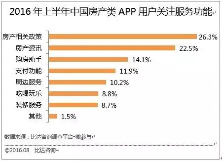 除了获取基本房源信息外,用户更希望了解相关政策和房产资讯,能为用户在房产交易中提供更多决策支持。其次,在线支付功能在房租和交易佣金的支付方面,也能为用户带来极大方便。另外,装修服务及资讯对于买房用户来说,具有极大的实用价值和参考意义。