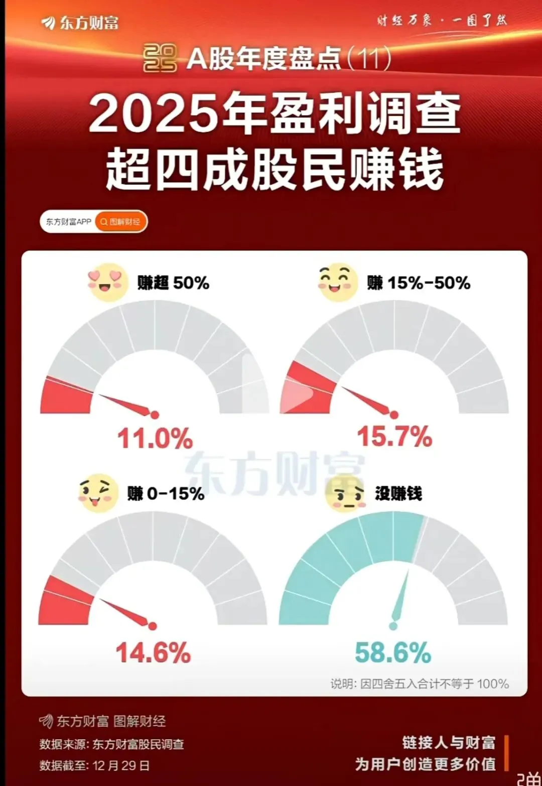 一、扎心的现实。2025这么好的年份,上证18%,创业板50%,6成股民亏损,摘自东财报告。