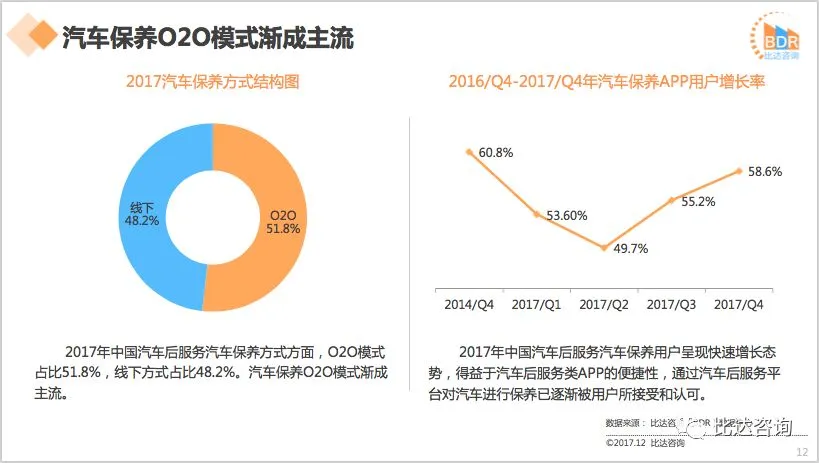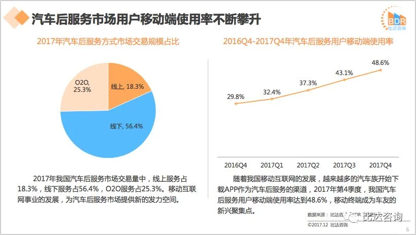 自2012年起,我国汽车后服务市场保持20%左右的高速增长态势,预计2017年汽车后服务市场规模达到11500亿元,同比增长19.8%。随着社会收入水平的提高,汽车从奢侈品变为日常代步工具,汽车保有量和驾照考证人数的持续增长,推动我国汽车市场大繁荣,惠及汽车产业链下游后服务市场的高速发展。2017年我国汽车后服务市场交易量中,线上服务占18.3%,线下服务占56.4%,O2O服务占25.3%。移动互联网事业的发展,为汽车后服务市场提供新的发力空间。