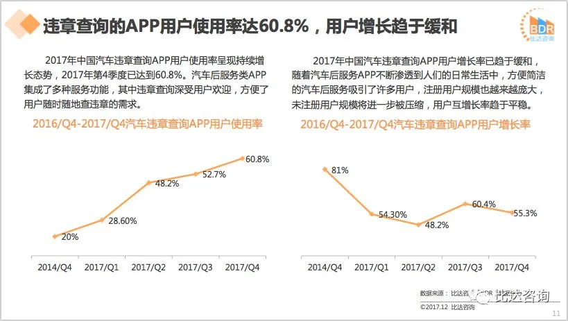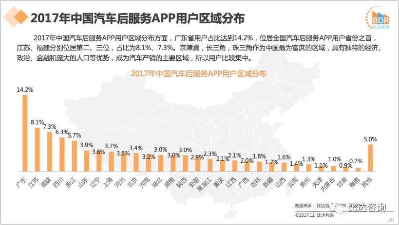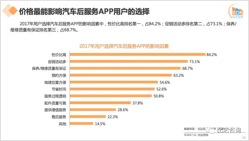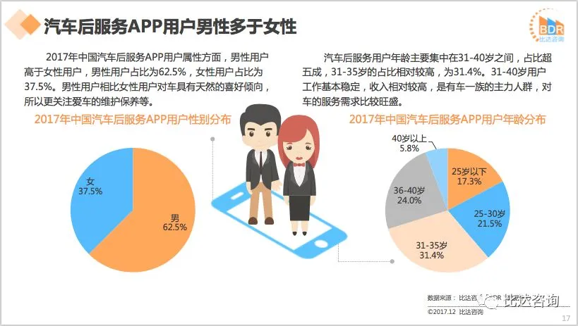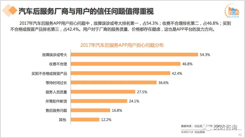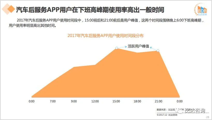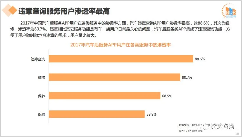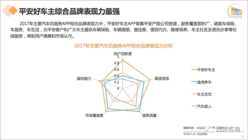 比达咨询(BDR)数据中心监测数据显示,2017年12月份,汽车后服务APP月活跃用户数方面,平安好车主月活跃用户数为1287.4万人,行业领先;其次为车主无忧月活跃用户数为455.3万人,途虎养车位居第三。