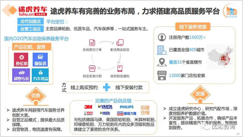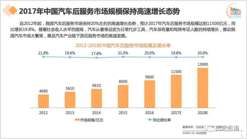 自2012年起,我国汽车后服务市场保持20%左右的高速增长态势,预计2017年汽车后服务市场规模达到11500亿元,同比增长19.8%。随着社会收入水平的提高,汽车从奢侈品变为日常代步工具,汽车保有量和驾照考证人数的持续增长,推动我国汽车市场大繁荣,惠及汽车产业链下游后服务市场的高速发展。2017年我国汽车后服务市场交易量中,线上服务占18.3%,线下服务占56.4%,O2O服务占25.3%。移动互联网事业的发展,为汽车后服务市场提供新的发力空间。