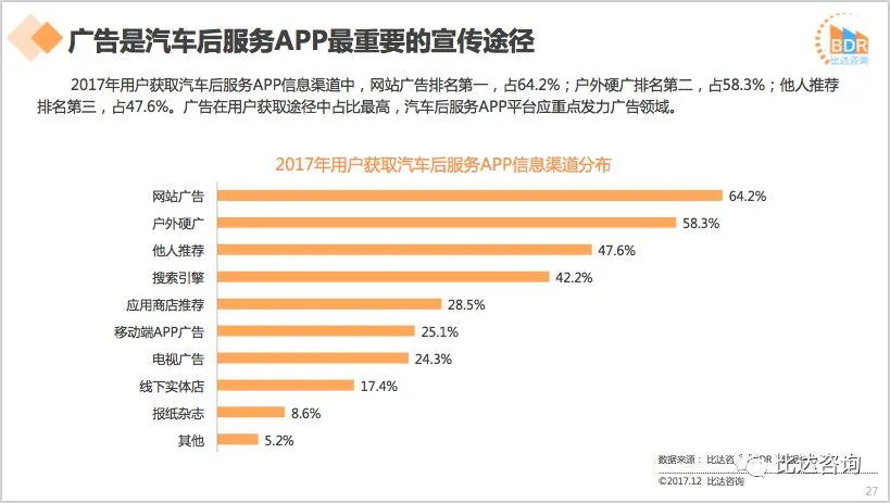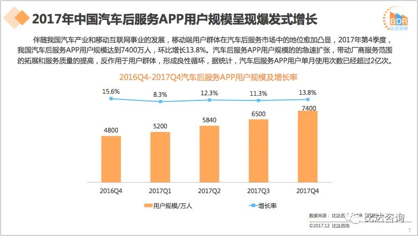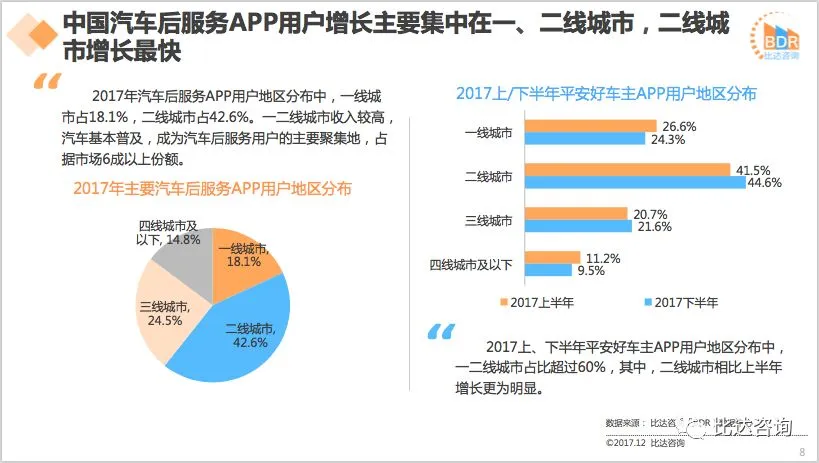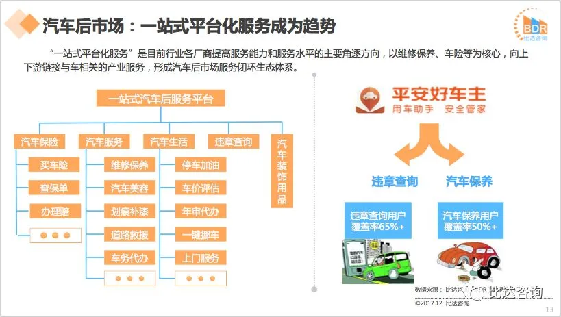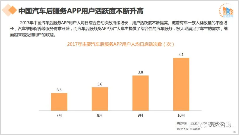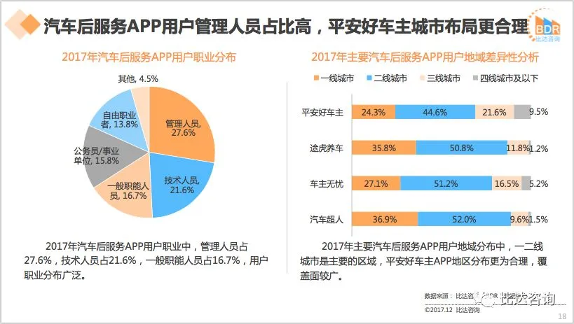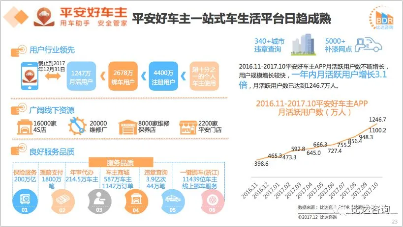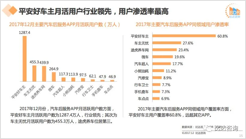 比达咨询(BDR)数据中心监测数据显示,2017年12月份,汽车后服务APP月活跃用户数方面,平安好车主月活跃用户数为1287.4万人,行业领先;其次为车主无忧月活跃用户数为455.3万人,途虎养车位居第三。