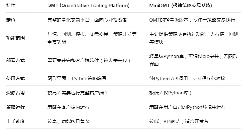 miniQMT 是 QMT 的轻量化简化版本,二者在定位、功能等多个维度差异显著,miniQMT 虽有灵活部署、低门槛等优点,但也存在功能精简等局限,目前多家主流券商均支持该工具,以下是详细介绍:
