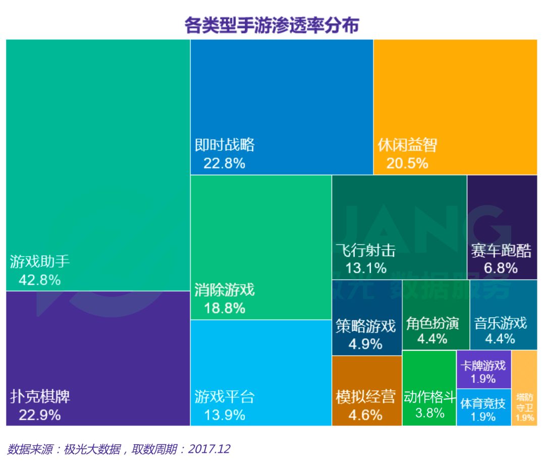 根据极光大数据显示,截至2017年12月最后一周,扑克棋牌类手游渗透率为22.9%,即时战略类为22.8%,休闲益智类为20.5%
