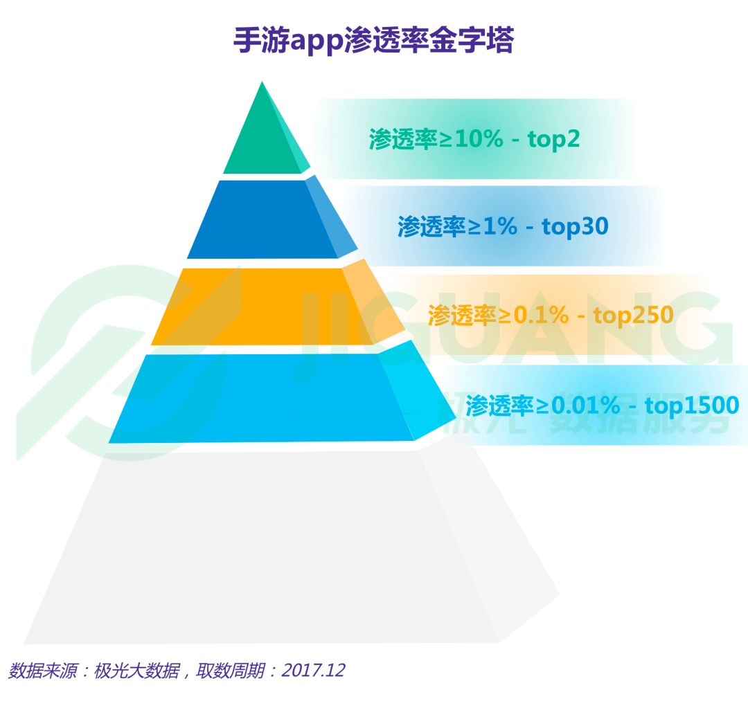 根据极光大数据显示,截至2017年最后一周,渗透率在10%及以上的手游app仅有王者荣耀和开心消消乐,渗透率在1%及以上的手游app约为30款