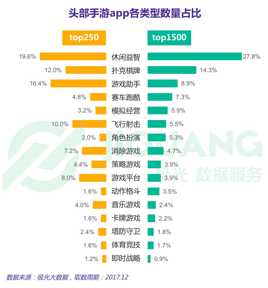 根据极光大数据显示,截至2017年最后一周,渗透率top1500的手游app中,休闲益智类占比27.8%,扑克棋牌类占比14.3%,渗透率top250的手游app中,19.6%为休闲益智类,10.0%为飞行射击类