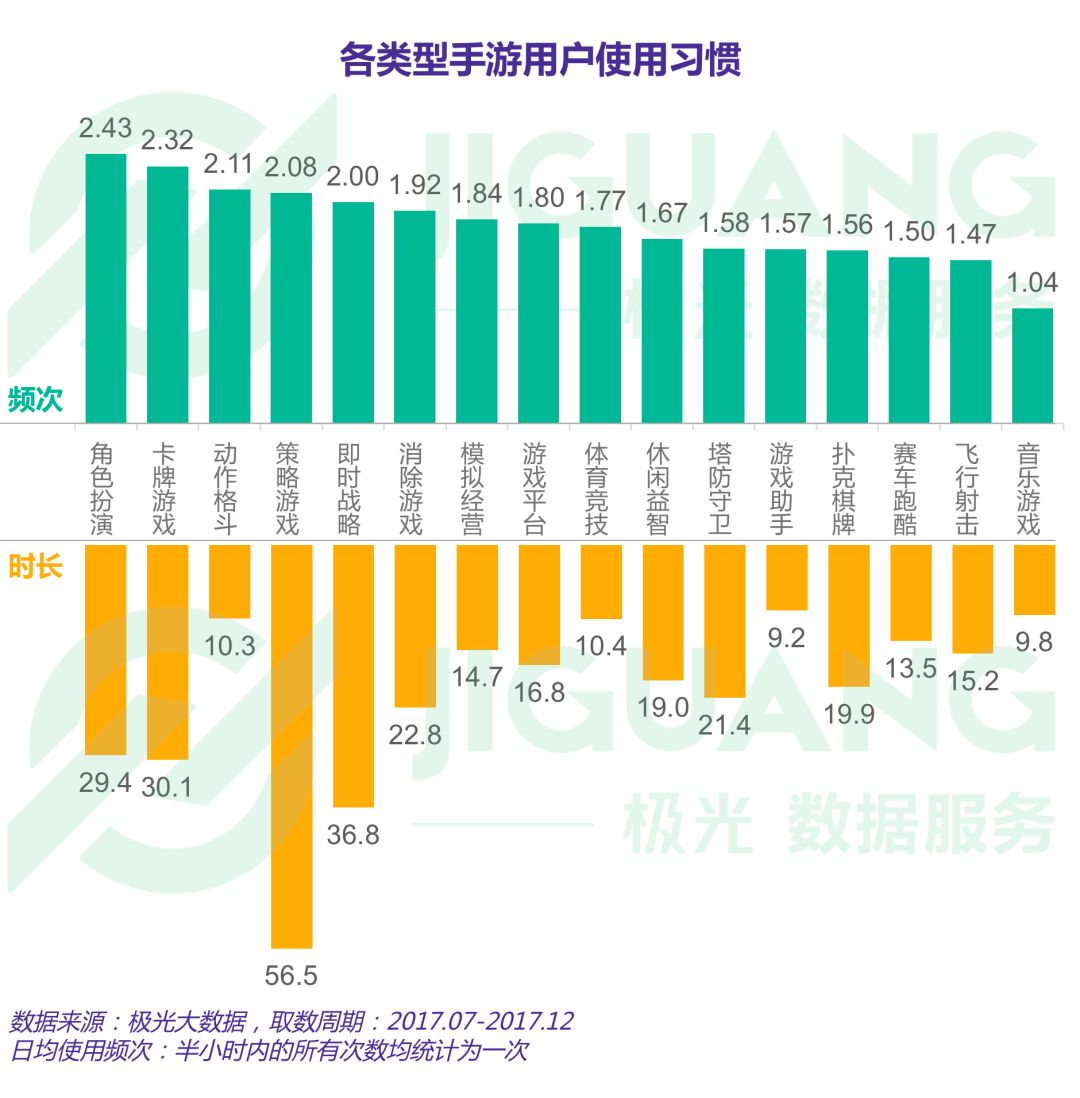 根据极光大数据显示,过去半年,角色扮演类手游日均使用频次为2.43次,卡牌游戏为2.32次