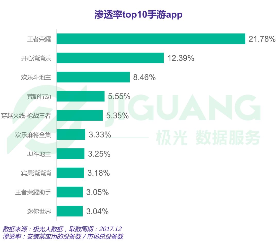 根据极光大数据显示,截至2017年12月最后一周,王者荣耀以21.78%渗透率居于首位,开心消消乐以12.39%占据次位
