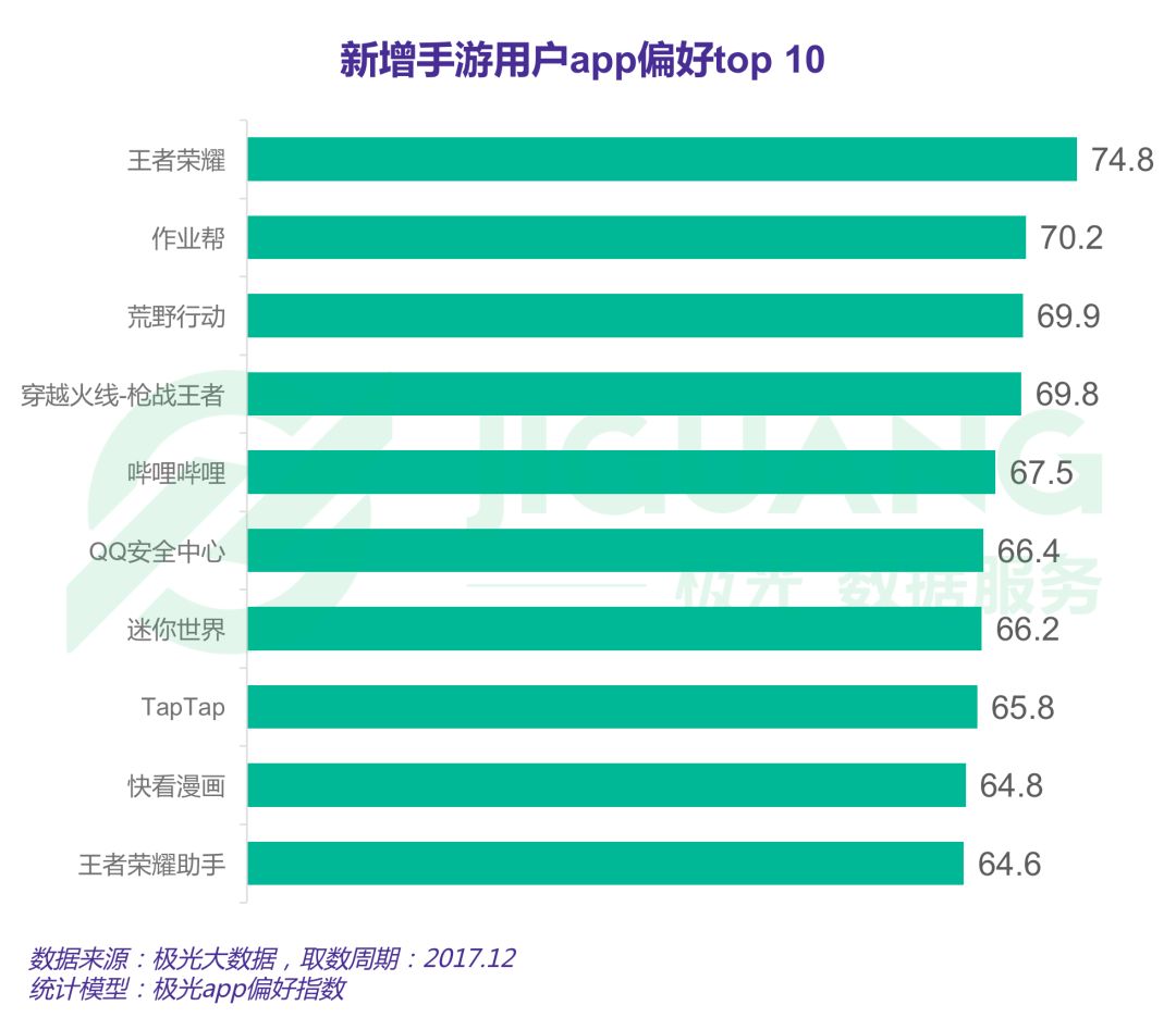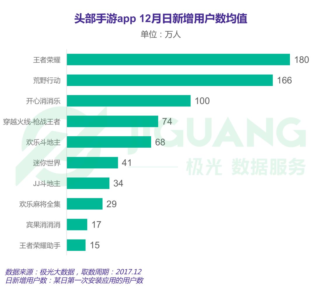 根据极光大数据显示,2017年12月,王者荣耀日新增用户数均值为180万,荒野行动为166万
