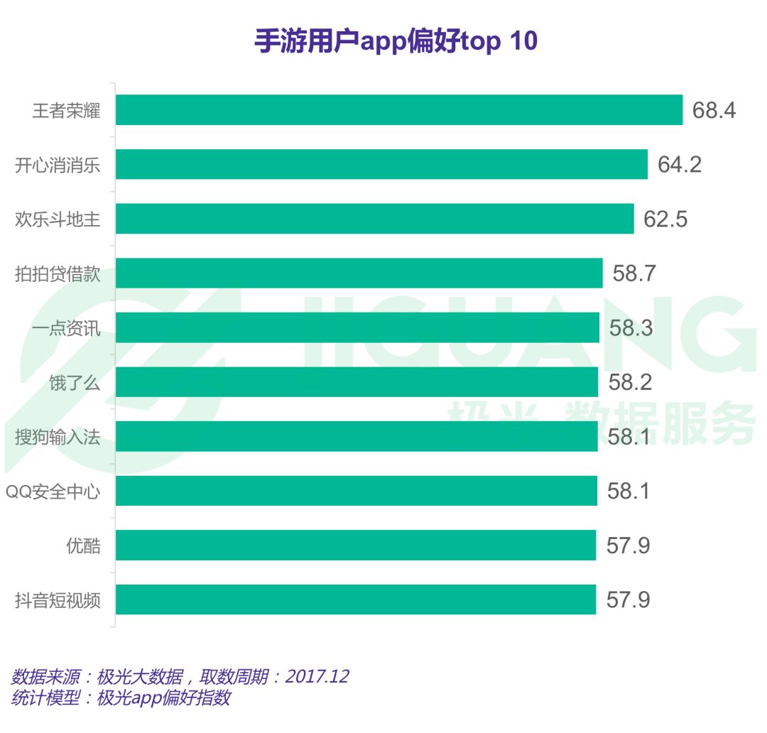 根据极光大数据显示,手游用户偏好top10的app中,王者荣耀居于首位,偏好值为68.4,开心消消乐居于次位