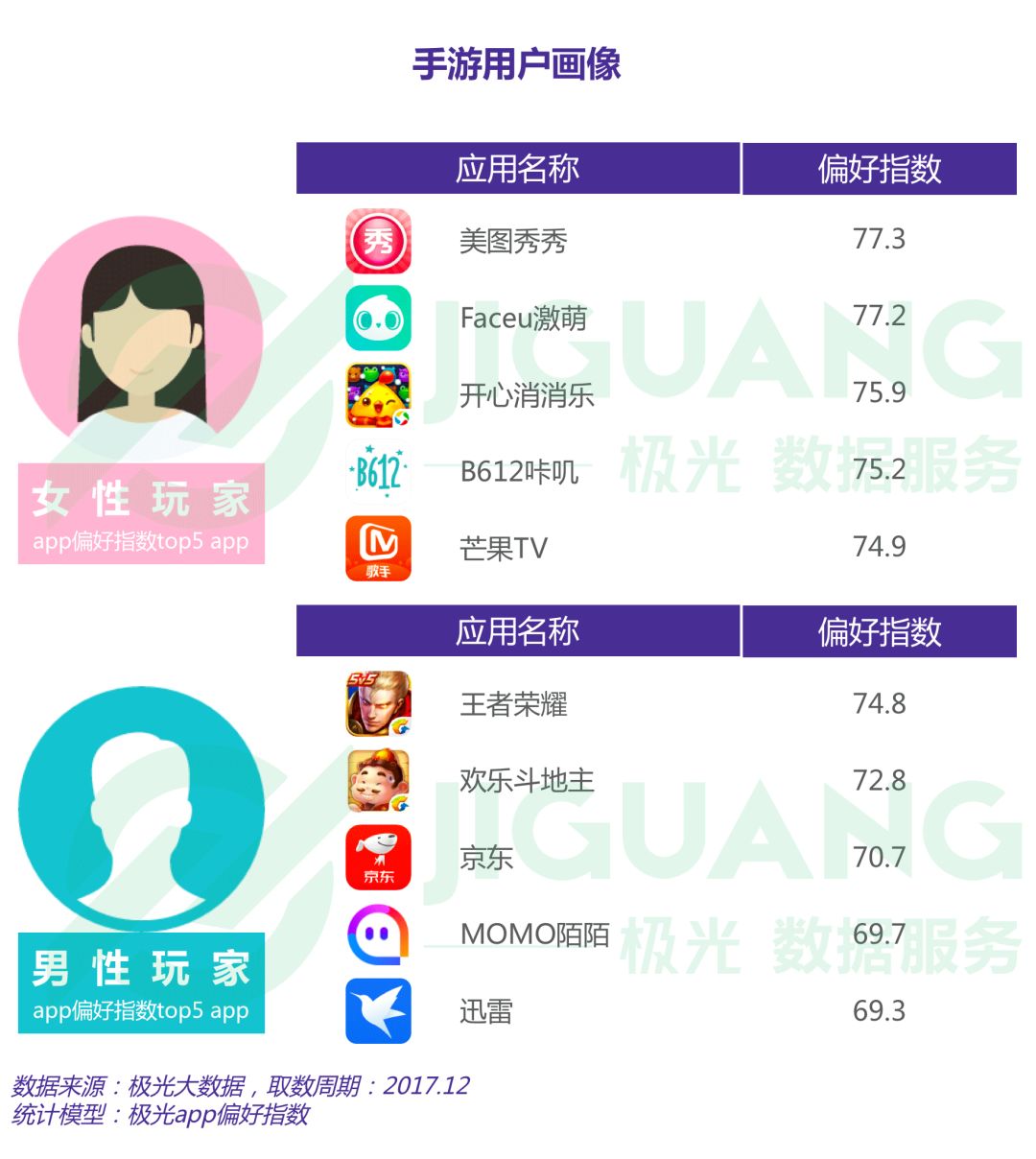 根据极光大数据显示,女性手游用户偏好拍照P图类app,男性手游用户偏好王者荣耀、欢乐斗地主和京东等