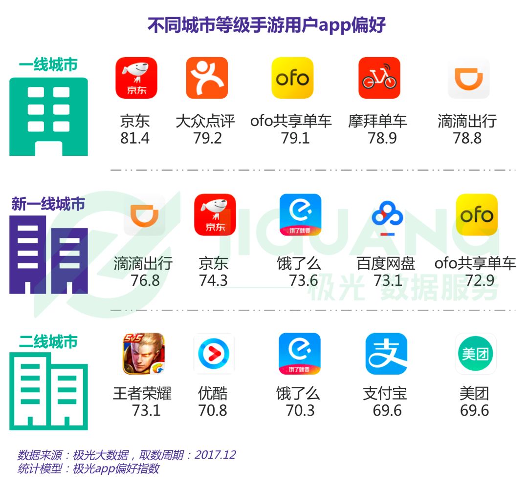 根据极光大数据显示,一线城市手游用户最为偏好京东,其次为大众点评,新一线城市手游用户偏好滴滴出行、京东、饿了么等app,二线城市手游用户偏好王者荣耀、优酷等
