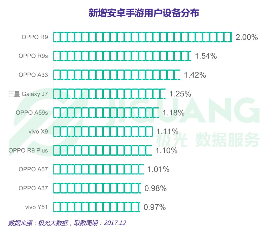 根据极光大数据显示,新增安卓手游用户中,2.00%为OPPO R9用户,1.54%为OPPO R9s用户