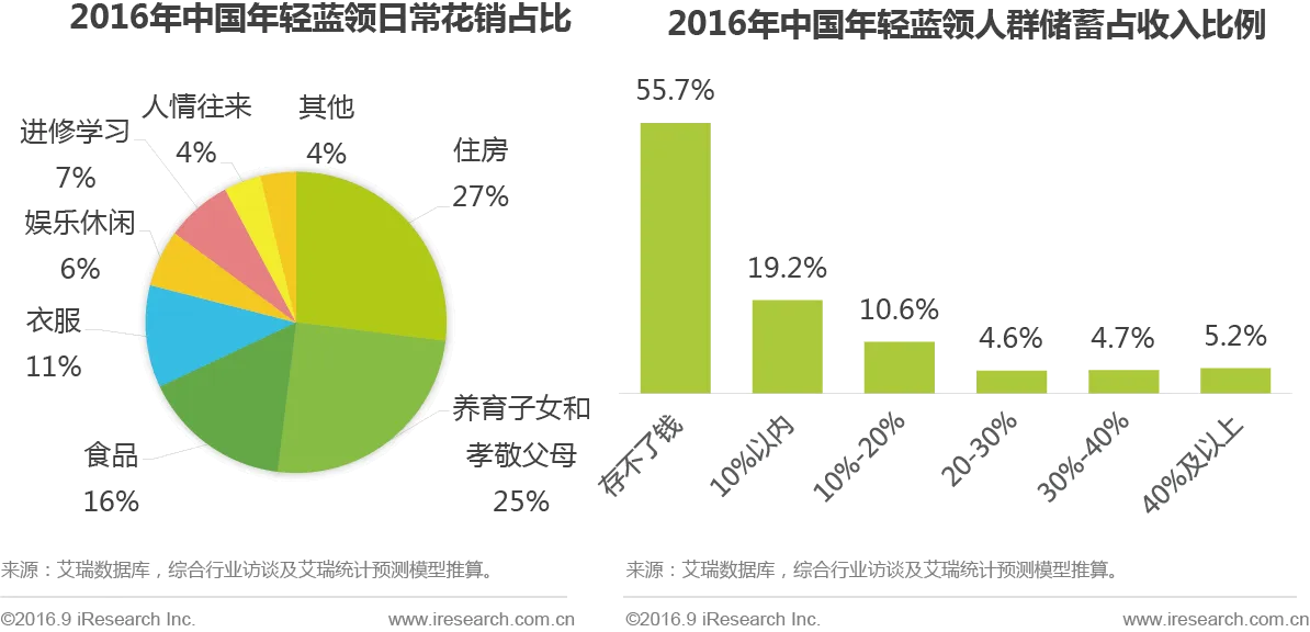 据艾瑞数据显示,2016年中国年轻蓝领阶层人均收入4000左右,其中北上广深的秘书、保姆/护工等职位工资最高,约为4820元。中国年轻蓝领日常花销中,住房和养育家庭等刚性花销占收入的主要部分,加总占比52%。紧跟其后的消费类花销,包括食品、衣服、娱乐等,总占比约33%。可见,年轻蓝领有着很强的消费力。