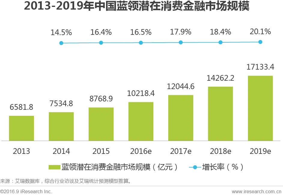 艾瑞咨询认为:2015年中国蓝领消费金融市场放款总量约为100亿,只覆盖潜在市场1.1%左右。随着今年更多竞争者进入蓝领消费金融市场,已有公司进一步扩大业务覆盖率,今年蓝领消费金融渗透率会继续增加。竞争企业少,市场渗透率低和潜在的庞大蓝领用户群体,让蓝领消费金融市场大有可为。