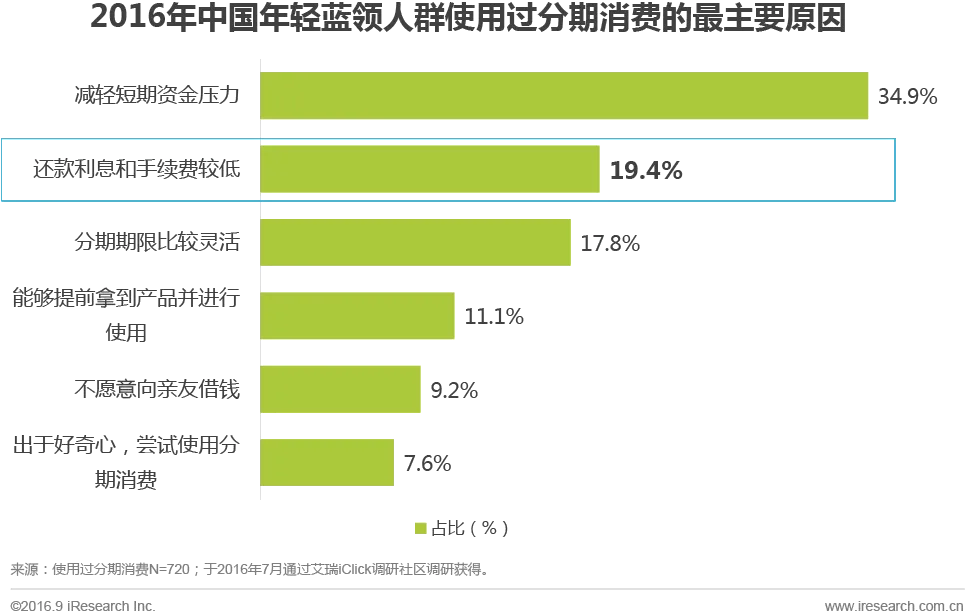 据艾瑞数据显示,超过50%的蓝领表示每个月存不下钱。此外,艾瑞咨询认为,蓝领人群不仅有强烈的消费意愿,并且具有冲动性消费的习惯,心态上更容易着急、缺乏耐心。但受限于蓝领人群有限的收入和不存钱的储蓄习惯,消费信贷很好地满足了蓝领人群较强的消费需求和急切消费的心态。按目前4000元左右的月收入衡量,如3C数码产品这样的一次性大额消费支出会对其造成较大的资金压力。短期大额消费的诉求和当月收入能力之间的矛盾,促使蓝领人群选择分期消费,一方面快速满足自身的消费需求,另一方面缓解了资金周转压力。