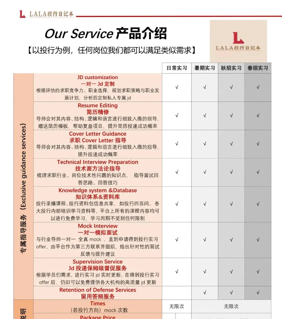 我们的服务主要包括专属导师1v1辅导、无限次Mock、简历修改、项目复盘、jd定制服务、对应赛道录播课程及笔试面试真题题库分享等!(内容详见视频)