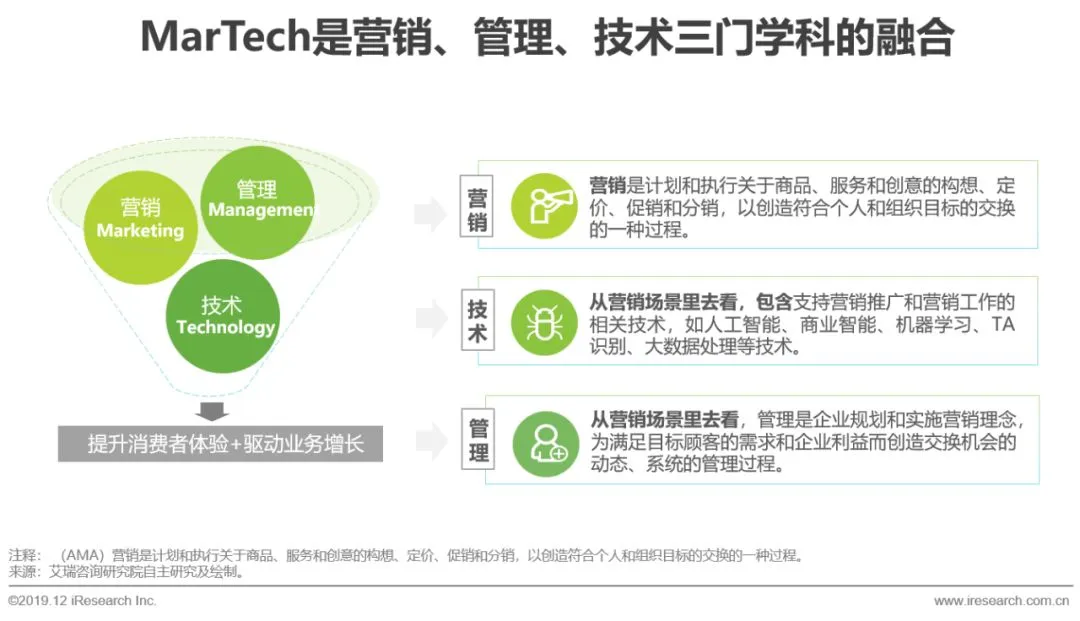 MarTech包含营销、技术和管理三门学科,三门学科的交叉融合使企业拥有使数据资产沉淀和精细化运营的能力。在具体的实践当中,使用者需具备理解营销、技术和管理中各种元素的能力,并有能力将各种元素整合成一个有凝聚力的整体,同时还需试图平衡企业组织中中心化和去中心化以及技术使用过程中自动化和人性化之间相互对立的力量,最终使MarTech的能力有效的贯穿到业务的使用和运营中,达到用MarTech提升消费者体验和驱动业务增长的目的。