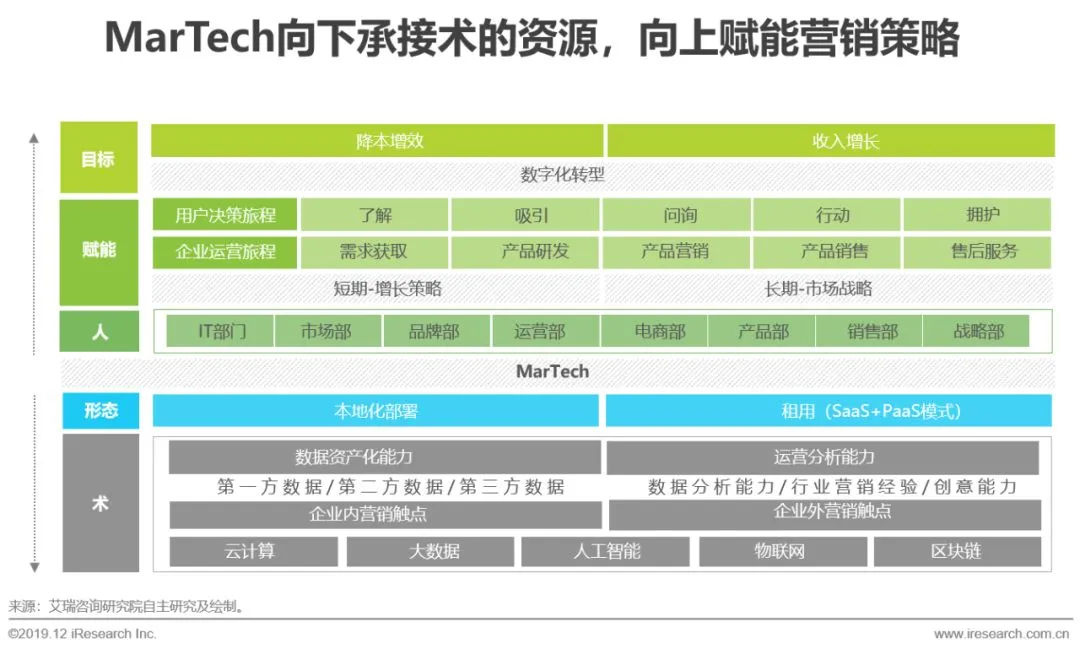 站在企业主第一方视角去看MarTech,MarTech向下承接“术”的资源,将所有基于技术衍生的数据和信息,如企业站内官网、终端门店、经销商等自有渠道及企业站外广告投放或供应链上的各触点数据,在云计算、人工智能、大数据等技术的支持下做数字资源的整合,向上为营销团队赋能,短期赋能增长策略,长期赋能企业市场战略。同时,在消费者了解到拥护的决策旅程和企业内部运营流程中,MarTech的使用也将保证营销内容输出和运营的科学性。