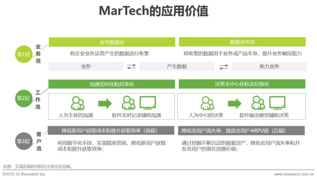 MarTech增强营销数字运营能力,提升企业竞争力从MarTech与营销工作的融合使用看,其价值主要体现在三个层面。第一层是业务上的价值, MarTech能力的贯穿可以将企业经营过程中不同业务系统的数据进行汇总和管理,从而建立一套有效的数据资产,数据资产化后再反哺于业务的创新和迭代;第二层是工作流上的价值,在营销工作中以往是以人为主体的沟通和决策,而现在则是人+技术的合作模式,使决策去中心化和去经验化;第三层则是,在MarTech贯穿业务流和工作流后,最终使企业在获得新用户阶段实现降本增效的目的,在用户留存阶段通过挖掘沉淀的数据资产实现精细化运营,降低老用户流失率和开发老用户的潜在消费价值。