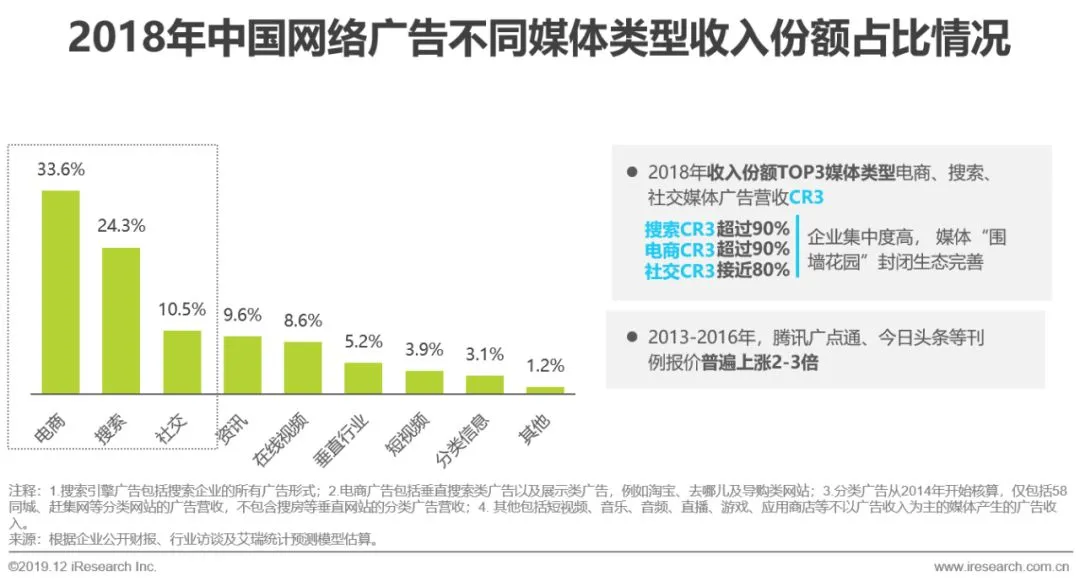 从网络广告不同媒体收入看,2018年收入份额TOP3媒体类型分别是搜索、电商和社交。再看TOP3媒体广告营收的企业集中度情况,搜索和电商媒体前三企业分别加总后的广告营收占比均超90%,社交类的也接近80%,企业集中度高,媒体平台数据开放程度也较低,整体来看,媒体“围墙花园”封闭生态完善。同时,2013-2016年腾讯广点通、今日头条等刊例报价普遍上涨2-3倍,流量价格持续走高。而当企业面临媒体入口流量价值封闭、价格又趋高时,尤其在流量红利不再明显时,必然要求企业对已获取的流量做数字整合和进行更深的价值挖掘,即存量数据盘活,但当下企业的信息化水平并不足以支撑企业数据资产的构建和应用,因此MarTech布局成为企业主的关注重点。