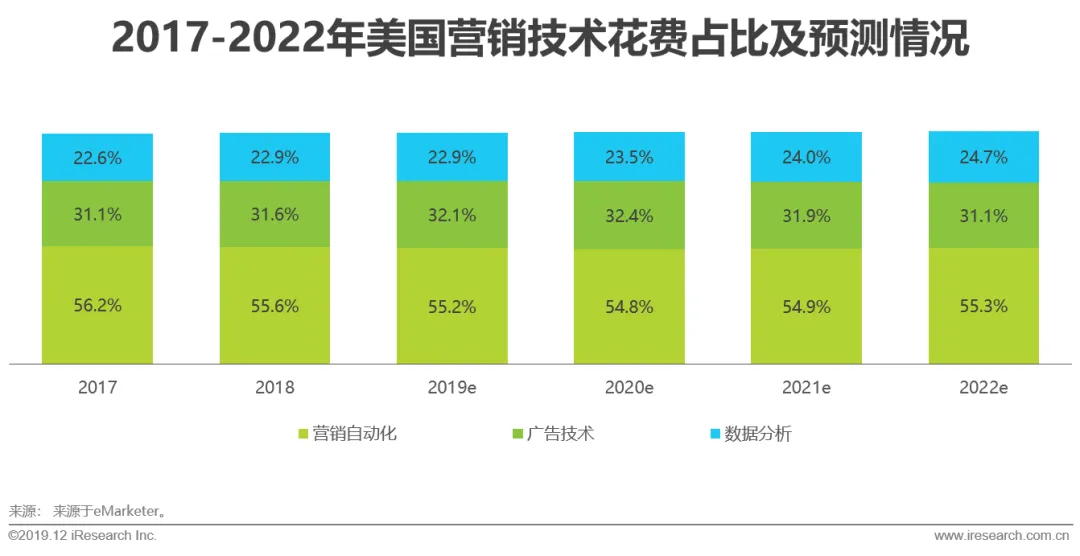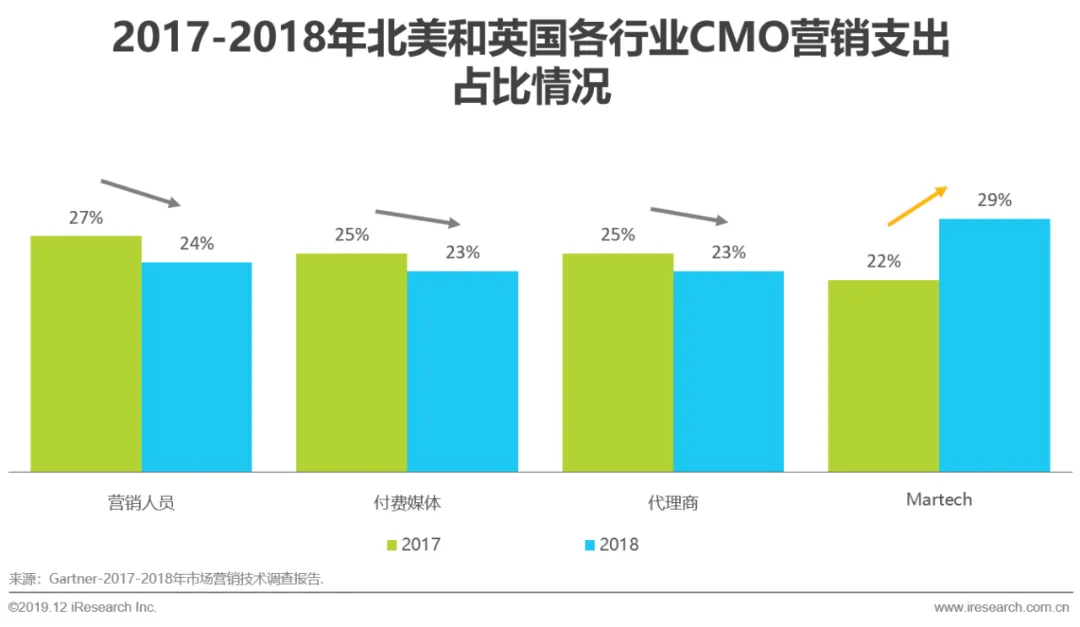 从欧美企业的投入看, MarTech具备解决营销问题的能力根据Gartner2017-2018年度CMO支出调查报告显示,2018年MarTech占营销费用总预算的29%,并高于2017年的占比22%,而营销人员、付费媒体、代理商的支出占比均呈下降趋势,可以看到CMO们正尝试用MarTech解决营销问题,MarTech市场前景良好。同时,Gartner还要求CMO们确定能够支持未来18个月营销策略中最重要的营销能力,“营销和客户分析”、“营销技术的获取和使用”及“客户体验”占据前三。分析三者的关系,“营销和客户分析”看重的是CMO在当下充满不确定性的市场中能对营销和客户进行正确分析的能力。而“营销技术的获取和使用”则看重的是CMO在是否能在众多营销技术中辨别出适合自己所在企业的营销技术的能力。排在第三的“客户体验”无论过去还是现在,都是CMO们的营销目标,而前两项则是提升客户体验的方式和能力。