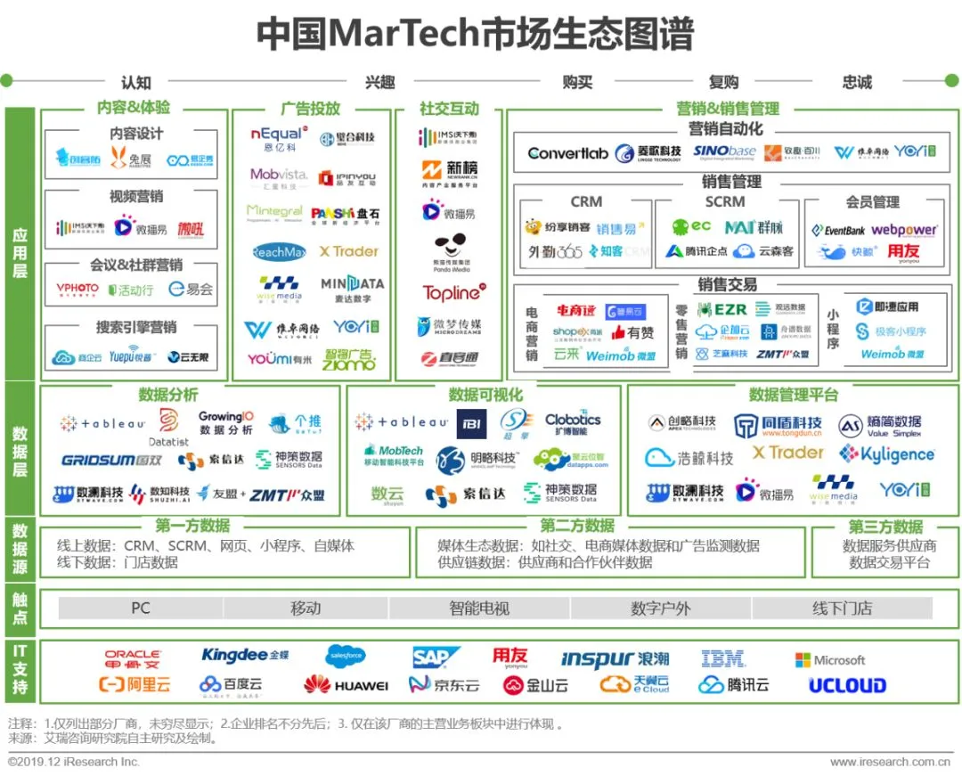 MarTech基于营销运营场景而生,各供应商业务模式关联度高综上所诉艾瑞分析认为,MarTech生态图谱中的业务场景基于营销运营生态场景而生,从产品诞生到营销再到销售及变现是一个完整的闭环路径,有很多子环节因为数据的共通性和营销目标的一致性而紧密相连,因此MarTech供应商为企业主提供的服务与上下子环节都存在高度相关性。理想状态下,企业内部之间破除壁垒达成相互协作的状态,而为企业主提供服务的外部供应商之间也从策略、目标到效果反馈都达成一致性,会有助于MarTech的价值释放。