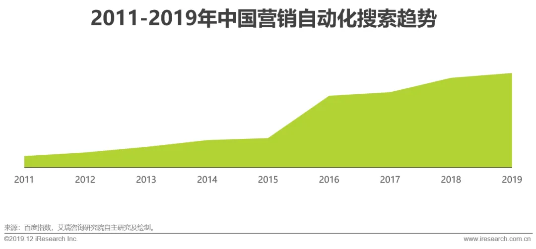 再看中国的营销自动化市场,营销自动化在2016年明显得到了市场关注,截止到2019年,营销自动化的搜索热度持续上升。同时面对媒体流量变贵以及存量用户需要精细化运营的客观现实下,营销自动化是企业触达存量用户的较优选择。