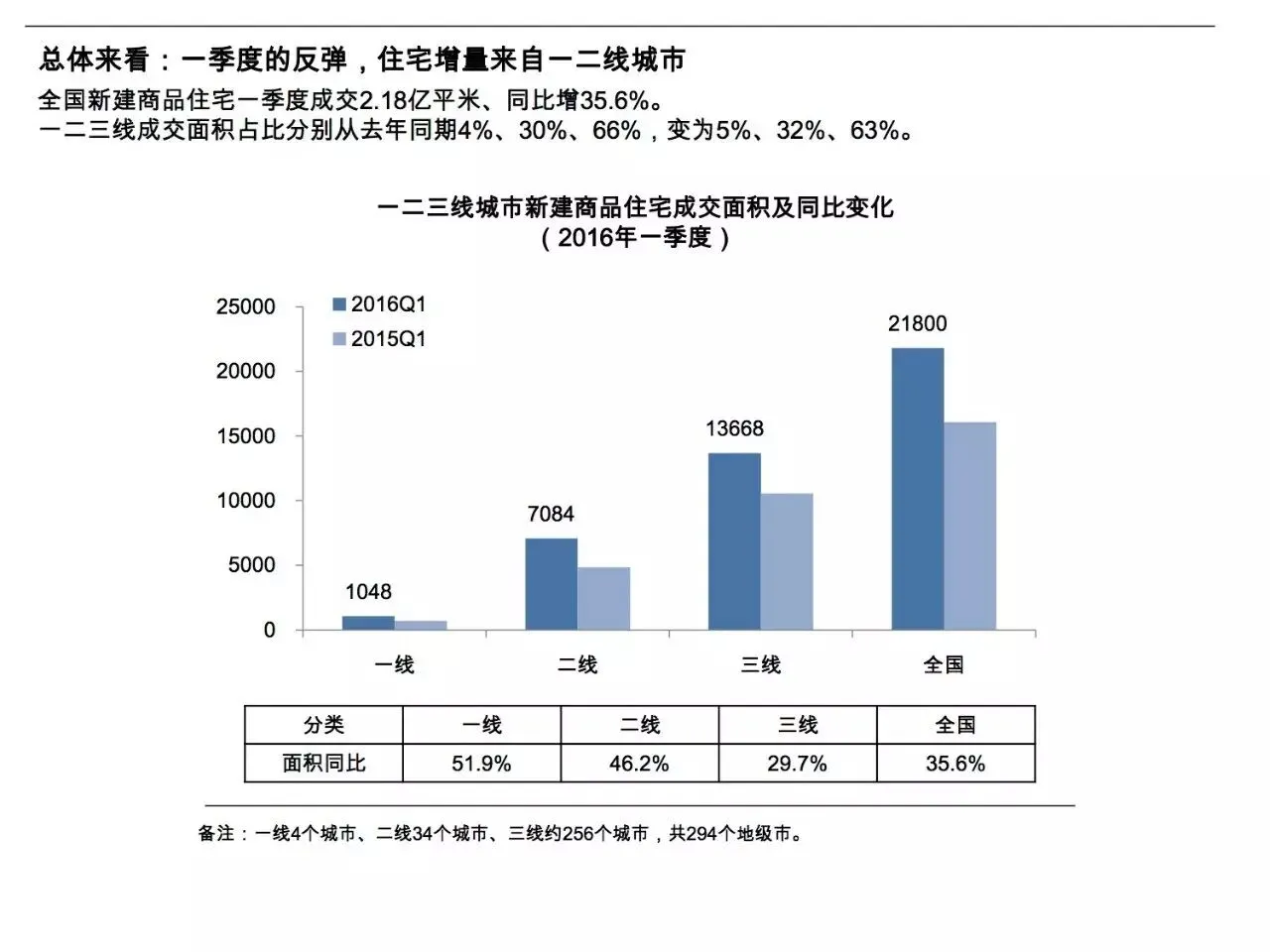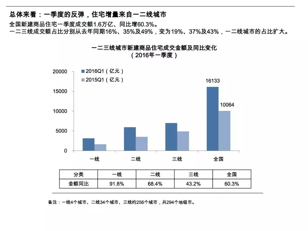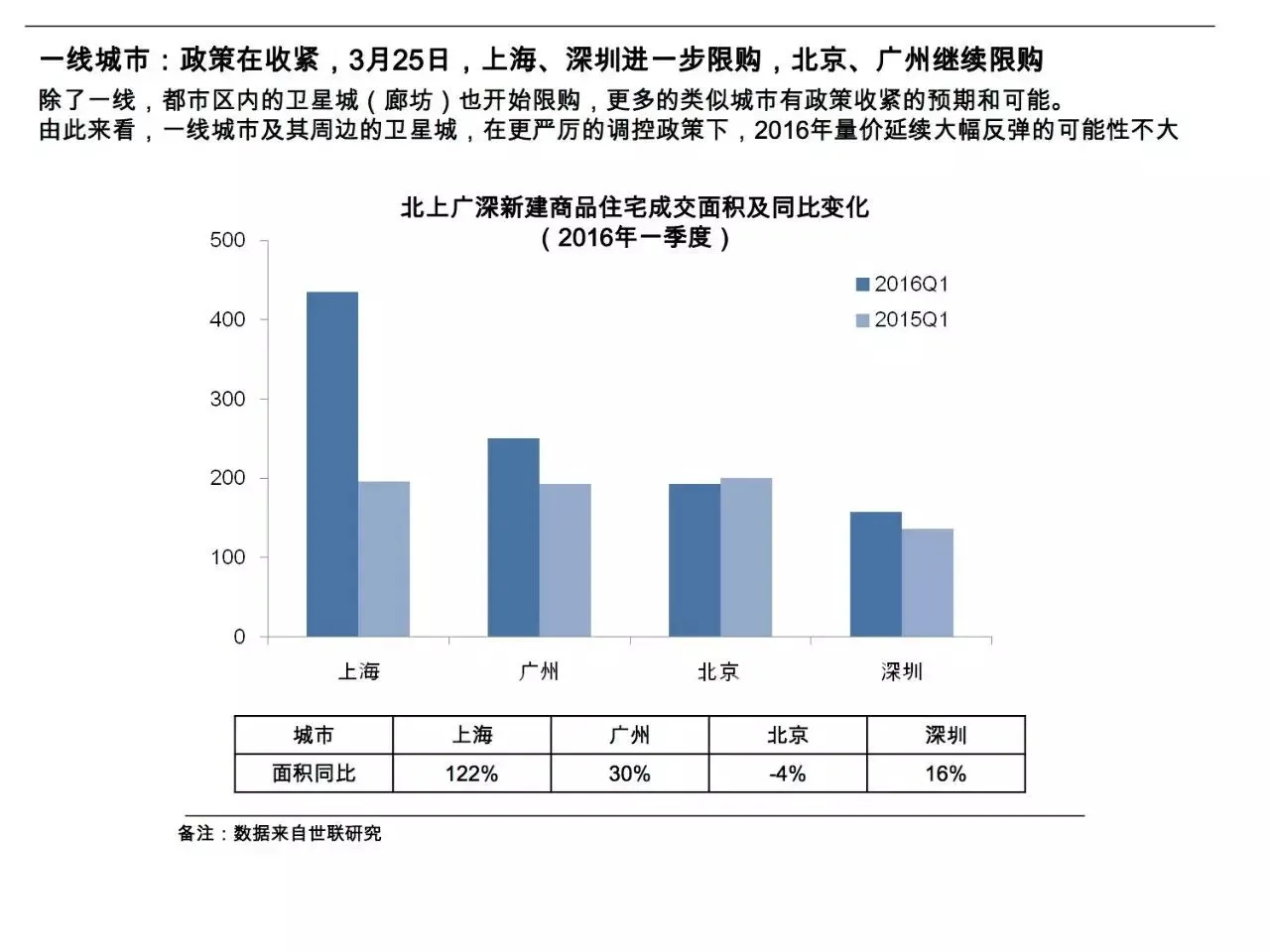 2016年一季度市场研究报告 ▏反弹真弹?持续可续?1行业整体回顾一季度增量,主要来自一二线住宅市场的量价反弹总结1. 一季度的反弹,来自上一轮政策刺激下的延续,结构分化的趋势不会逆转,冰火共存成为常态。 2. 行业投资、新开工等领先指标的走势尚未回稳,取决于后市资金面、政策面对需求端的拉动作用是否会持续。2住宅市场展望一线熄火、二三线取决于未来的政策走向总结1. 一季度,住宅的增量,主要来自一线城市+卫星城、二线城市,三线城市基本无反弹;2. 一线城市已经出台收紧政策、市场熄火,需求不会流向二线;二线也存在政策收紧预期,同样,一旦熄火,需求也不会流向三线;3. 二线、三线城市未来走势,取决于政策:二线取决于是否会加强调控;三线市场要好转,取决于农民进城购房和身份平等化、以及棚改货币化的力度。3商办市场展望普遍痛点、难以反弹总结1. 商办市场整体不看好,库存积压严重,去化时间更长;2. 实体经济回落和电商冲击下,商办经营依靠传统的收租模式难以持续;3. 从国际规律看,全球商用物业交易额80%集中在不超过20个城市。国内城市的商办物业过剩,已成为普遍痛点。4国际借鉴成熟市场的启示总结1. 中国房地产市场的下半场,进入大都市圈化及行业规则与国际接轨的探索建立期,增量市场已不足以反映行业未来趋势;2. 未来两到三年,是摸着石头过河的新模式诞生期,行业政策的新布局会逐步明朗;3. 从历史经验来看,过渡期内,行业及政策的波动、反复,都是正常的,保持平常心。房地产业在经济发展中的地位无可撼动。【世联行集团市场研究部】让更多人享受真正的地产服务