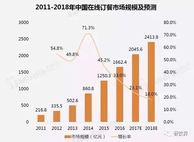 中国在线订餐市场自2011年一直保持较高速增长,2017年市场规模预计达到2045.6亿元,增长率为23.1%。