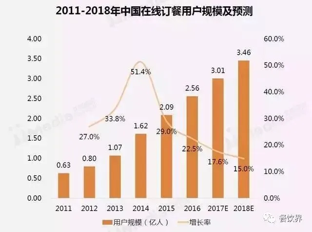 2016年中国在线订餐用户规模达到2.56亿人,而 2017、2018年在线订餐用户规模预计将分别达到3.0和3.5亿人。