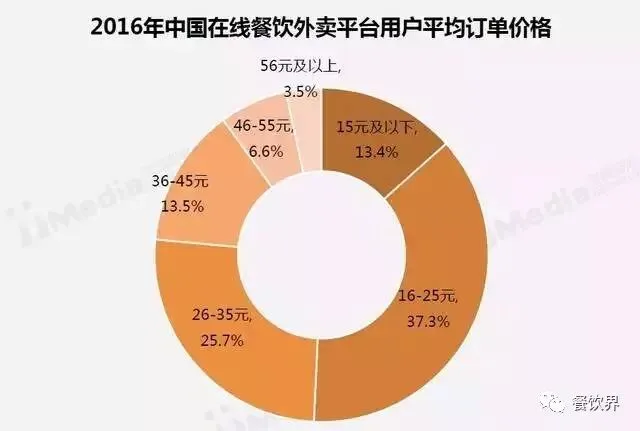 外卖用户平均订单价格数据显示,消费15元及以下外卖订单的用户占13.4%,消费16-25元外卖订单的用户占37.3%,45元以上的外卖消费用户只占了10.1%。