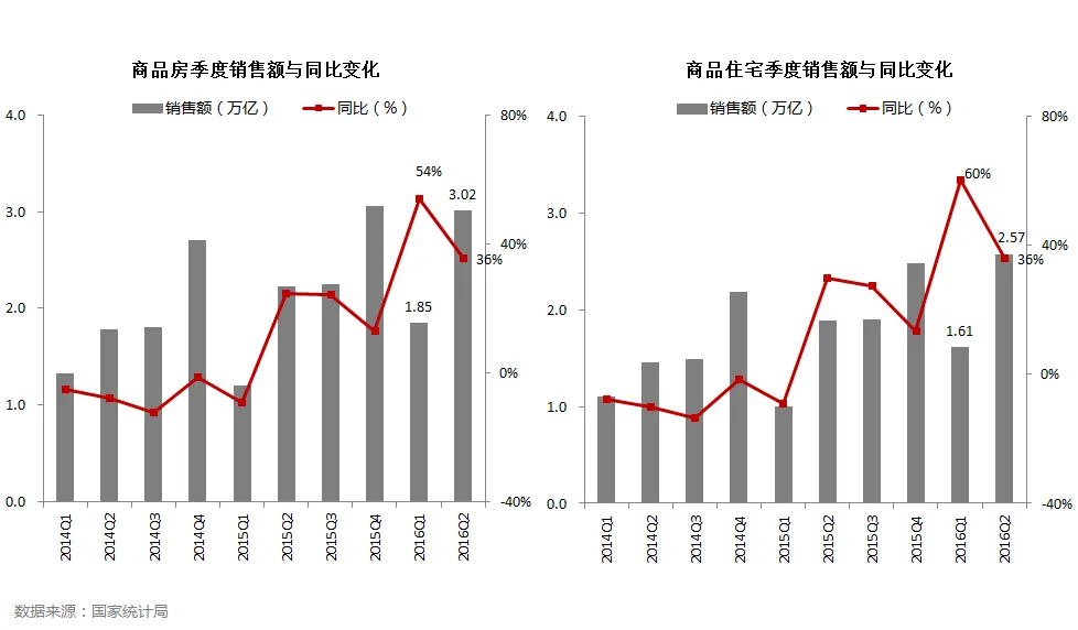 • 2016年二季度商品住宅销售额为2.57万亿元,同比增长36%,增速较一季度下滑24个百分点。