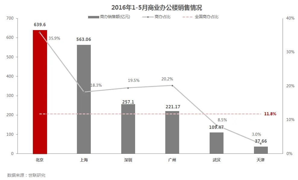 • 全国商办物业销售额占商品房总额11.8%,而上深广接近两成,北京更达35%,一线的活跃程度远高于全国其他城市。