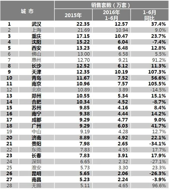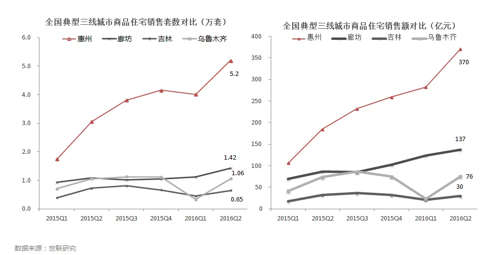 • 2016年1-6月,惠州商品住宅销售套数是吉林市的7倍,廊坊是乌鲁木齐的2倍;