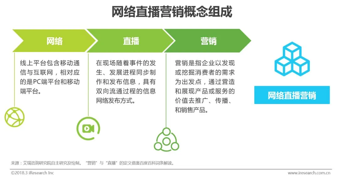 本报告的研究范畴为网络直播营销。是指采用视频直播形式在PC端及移动端上,为企业商家达到品牌推广或产品销售的目的所进行的营销。必备的特征包括:以营销为目的、以直播为方式、以线上为平台(不包括传统的电视直播)。