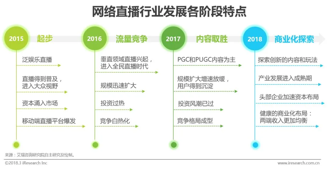自2015年网络直播正式得到普及并进入大众的视野开始,行业经历了资本的涌入和白热化的竞争,到2017年竞争格局逐步形成,用户沉淀后规模扩大的速度有所放缓。随着行业的逐渐稳定,全民直播的风潮也渐渐消退,真正优质的PGC和PUGC内容得以被保留并成为主流。在行业进入成熟期的情况下, 当下发展的重点在于建立起真正健康的、规模化的商业模式,各平台开始逐渐重视来自于B端的收入,并且开始关注如何利用直播的优势和特点帮助广告主进行产品和品牌的营销,从而实现最大程度的流量变现。