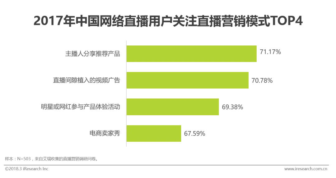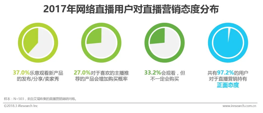 根据艾瑞用户调研的结果来看,观看直播的用户普遍对于直播过程中的营销行为持有正面态度,其中甚至有64%的用户观看直播时带有消费目的性。现今,将直播与营销结合起来的模式已经开始普及并逐渐得到大众的接受,作为一种新生的广告形式,直播营销对于用户最大的价值在于依附于直播这种双向交互的传播形式为用户带来更多有质量的内容信息,制作精良的直播内容、受关注的明星主播、直播营销过程中提供的品牌优惠活动等因素都能吸引更多流量,调动用户的积极性。