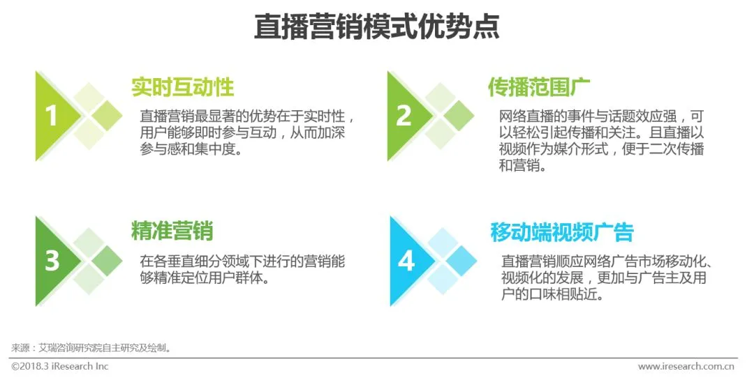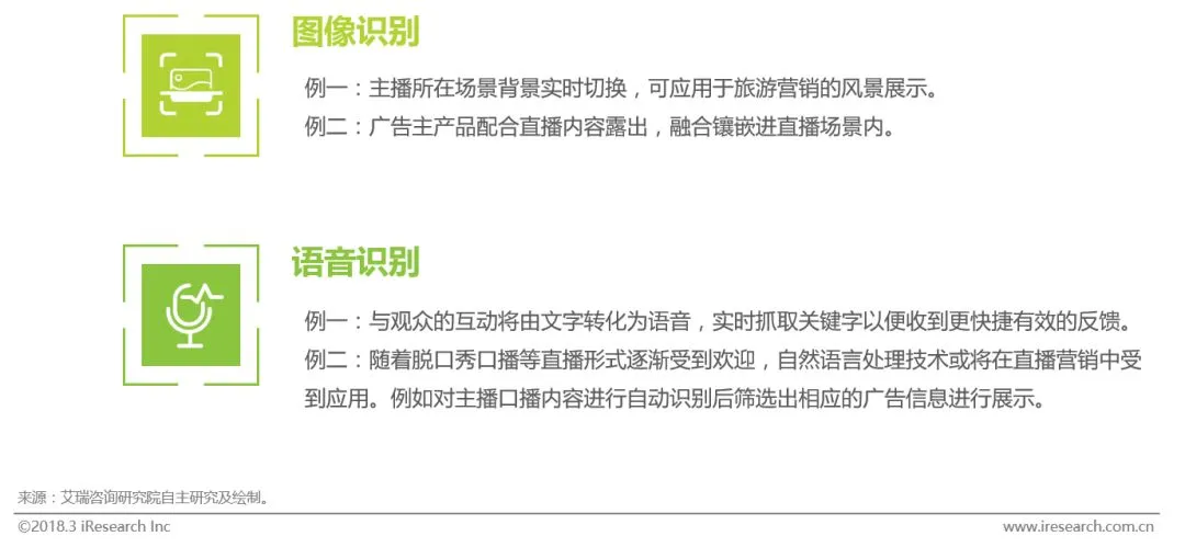 2018年1月,基于直播延迟时长缩短、云端混流、音视频直播与答题系统的同步控制等技术的发展,直播答题迅速得到普及并风靡一时,更有平台在短时间内将题目内容与广告营销结合,获得广告主投资,成功实现商业化。技术的不断提升为直播营销带来更多的可能性,艾瑞分析认为,未来图像识别和语音识别或将成为智能技术提升的重点,直播平台将着力于为用户提供更好的场景化体验,为广告主创造更好的营销环境。