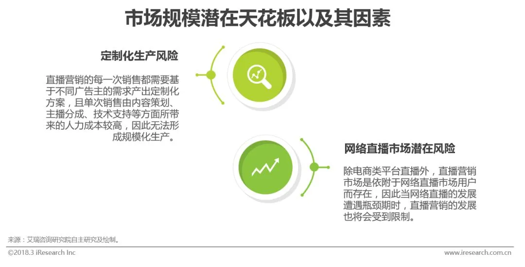 综合考虑直播营销未来市场规模的发展,其上升潜力来自于各直播平台的商业化加码以及市场中有待开发的广告主资源,但直播营销定制化的生产方式使得其单次销售人力成本较高,且无法形成规模化。这一特点有可能会在直播营销未来的规模发展中形成壁垒。另一潜在风险来源于存在波动的网络直播市场,由于直播营销的发展与网络直播市场不可分割,后者未来可能存在的一些潜在问题,例如内容和互动方式的限制、用户的疲软期等,都可能直接影响直播营销的发展。