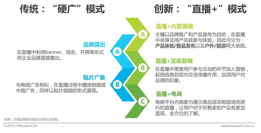 4.直播营销总体可被分成传统的“硬广”和创新的“直播+”两种模式。其中“直播+”模式包含内容营销、互动营销以及电商三个种类。两种模式各有优势,可供广告主灵活选择。而“直播+”作为一种可无限延展的形式,在未来或将成为主流。