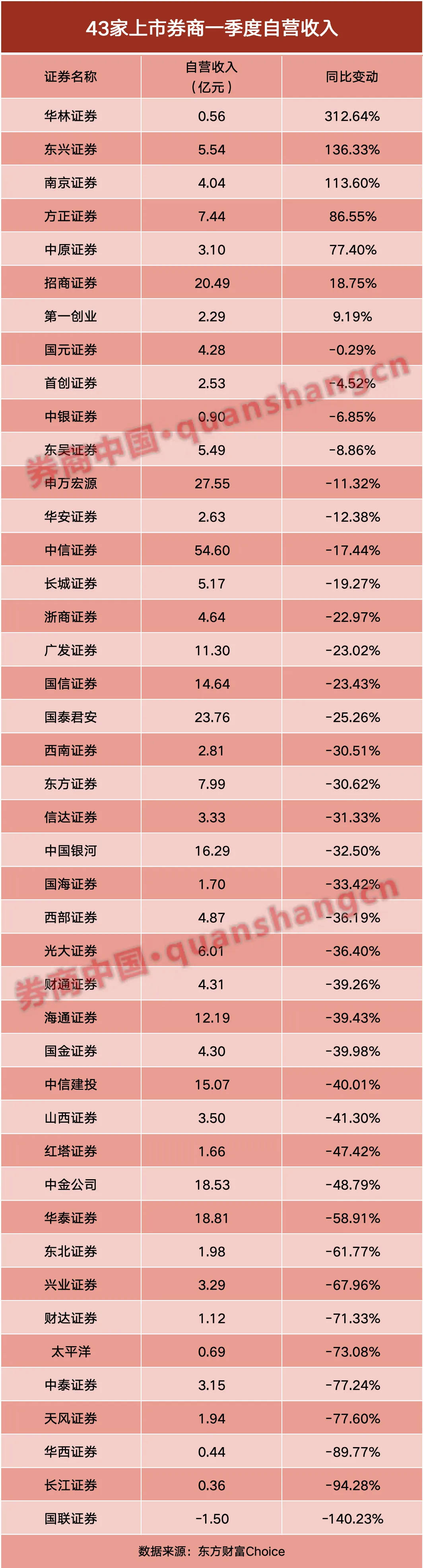 今年一季度,43家上市券商中,仅有为数不多的几家券商净利润实现正增长。其中,中原证券、东兴证券、方正证券、首创证券、南京证券的增幅均在20%以上。西南证券和第一创业归母净利润微增,但营收有所下滑。