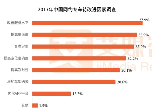 从行业的客观发展趋势来看,整个市场也朝着品质服务的方向在不断发展。在艾媒咨询报告中,针对2017年网约车待改进因素方面,有37.9%的用户认为需要改善服务水平,同时有35.9%的用户认为需要提高舒适度,另外还有30.1%的用户认为要提高及时性,这些都是与服务品质息息相关的选项。可见在激烈的市场竞争中,网约车平台的核心竞争力已经不再是价格,而是服务质量以及态度的改善、服务及时性的提高都是用户关注的重点。