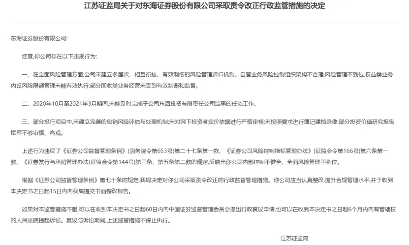 江苏证监局表示,经查,东海证券在全面风险管理方面,未建立多层次、相互衔接、有效制衡的风险管理运行机制。自营业务风险控制组织架构不合理,风险管理不到位,权益类业务内设风险限额管理未能有效执行;部分固收类业务经营未受到有效制衡和监督。