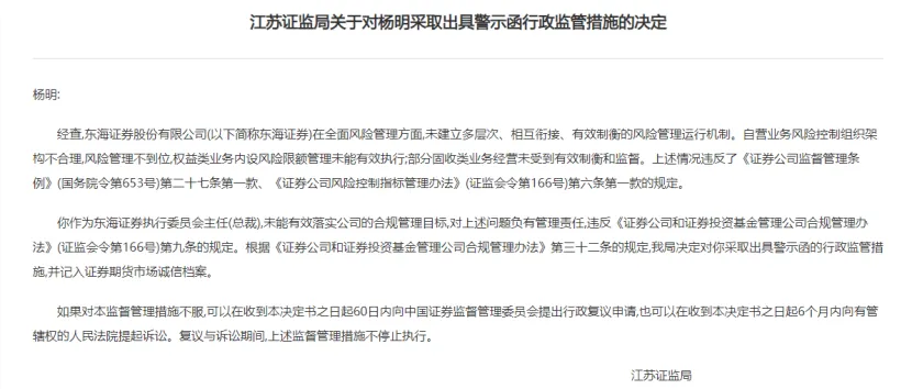 杨明作为东海证券执行委员会主任(总裁),未能有效落实公司的合规管理目标,对上述问题负有管理责任。因此,江苏证监局决定对杨明采取出具警示函的行政监管措施,并记入证券期货市场诚信档案。