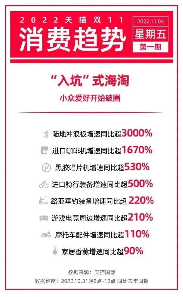 从天猫双11来看,很多新的消费趋势正在浮现,更趋多样化和个性化,进口消费也从美妆、母婴等传统进口类目到更多小众、圈层消费趋势显著浮现。年轻人的新潮流生活方式在双11期间开始涌现:陆地冲浪板、黑胶唱片机、骑行装备、路亚垂钓装备增速很快。