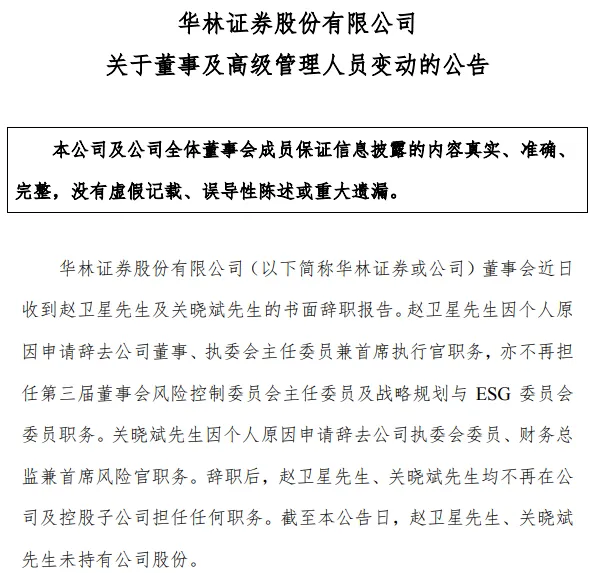 与此同时,原首席执行官兼执委会主任委员赵卫星因个人原因申请辞去相关职务。华林证券在公告中表示,赵卫星任职期间,积极推动公司科技金融转型,董事会对赵卫星为公司发展做出的贡献表示感谢。