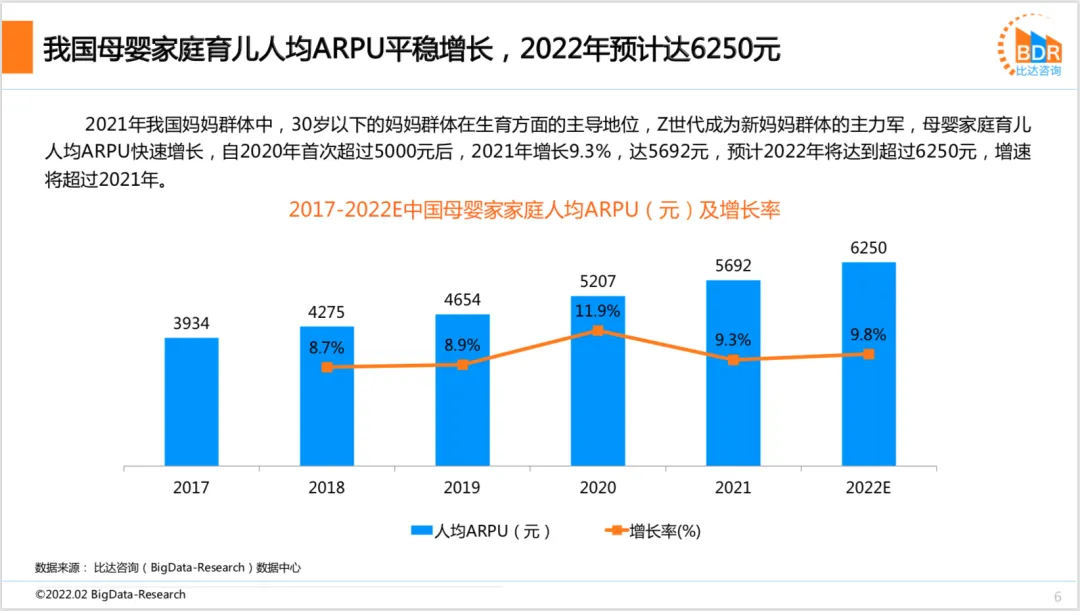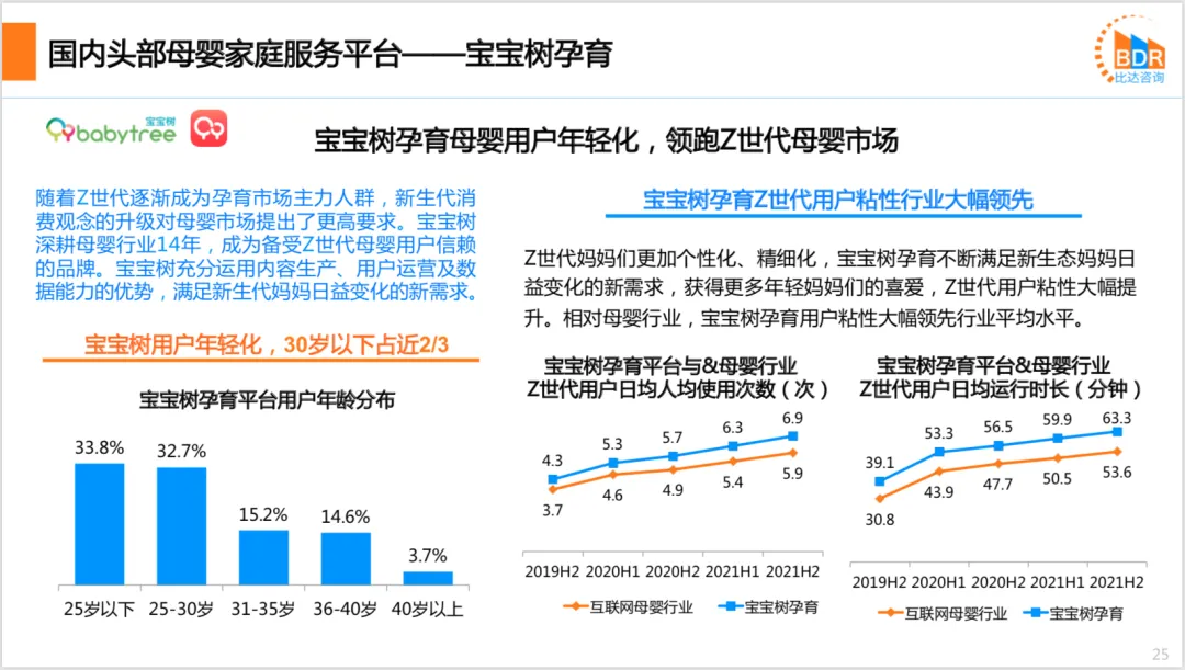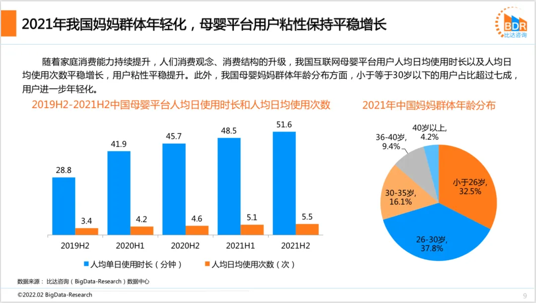 2021年度中国互联网母婴市场研究报告2021年我国妈妈群体中,30岁以下的妈妈群体在生育方面的主导地位,Z世代成为新妈妈群体的主力军,母婴家庭育儿人均ARPU快速增长,自2020年首次超过5000元后,2021年增长9.3%,达5692元,预计2022年将达到超过6250元,增速将超过2021年。2021年母婴线上渠道规模占比达25.9%,疫情后线上消费习惯得以保持,预计未来几年仍将保持高位。随着消费升级,育儿成本上升,母婴行业伴随着线上带货直播风口顺势而行,预计2022年中国母婴行业市场规模将突破5.4万亿元。我国家庭消费能力持续增长,人们消费观念、消费结构的升级,促进互联网母婴行业规模不断壮大。互联网零售、电商直播等迅猛发展,带动母婴领域市场扩展,加速产业链线上线下融合布局。我国母婴电商渗透率稳步增长,预计2022年达32%,2022年母婴电商市场规模将突破万亿元。随着家庭消费能力持续提升,人们消费观念、消费结构的升级,我国互联网母婴平台用户人均日均使用时长以及人均日均使用次数平稳增长,用户粘性平稳提升。此外,我国母婴妈妈群体年龄分布方面,小于等于30岁以下的用户占比超过七成,用户进一步年轻化。2022年4月19-20日 杭州