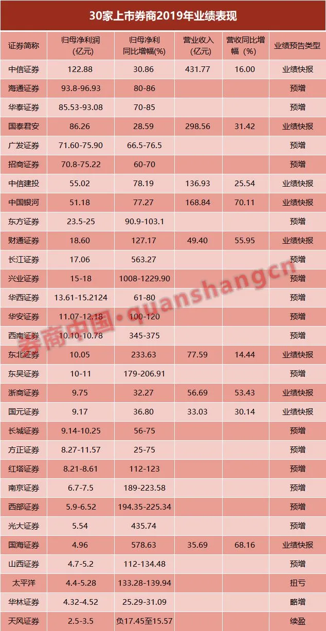 30家上市券商业绩曝光,半数净利增1倍!龙头券商位次初定,中信、海通、华泰、国君暂居前四